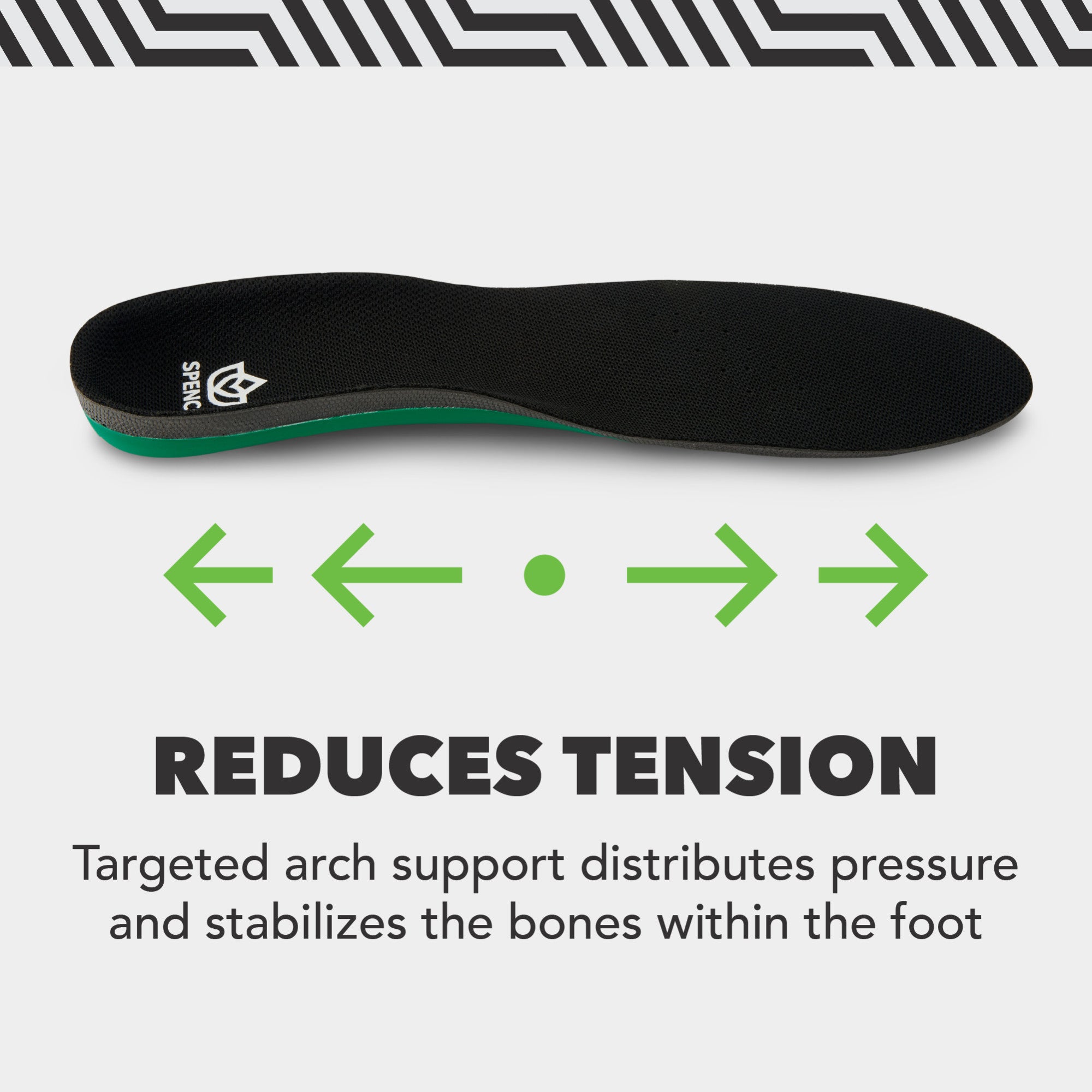 The Spenco Men’s Plantar Fascia insole features a rearfoot stability plate that helps relieve pain from repeated stretching, minor tears and inflammation of the plantar fascia