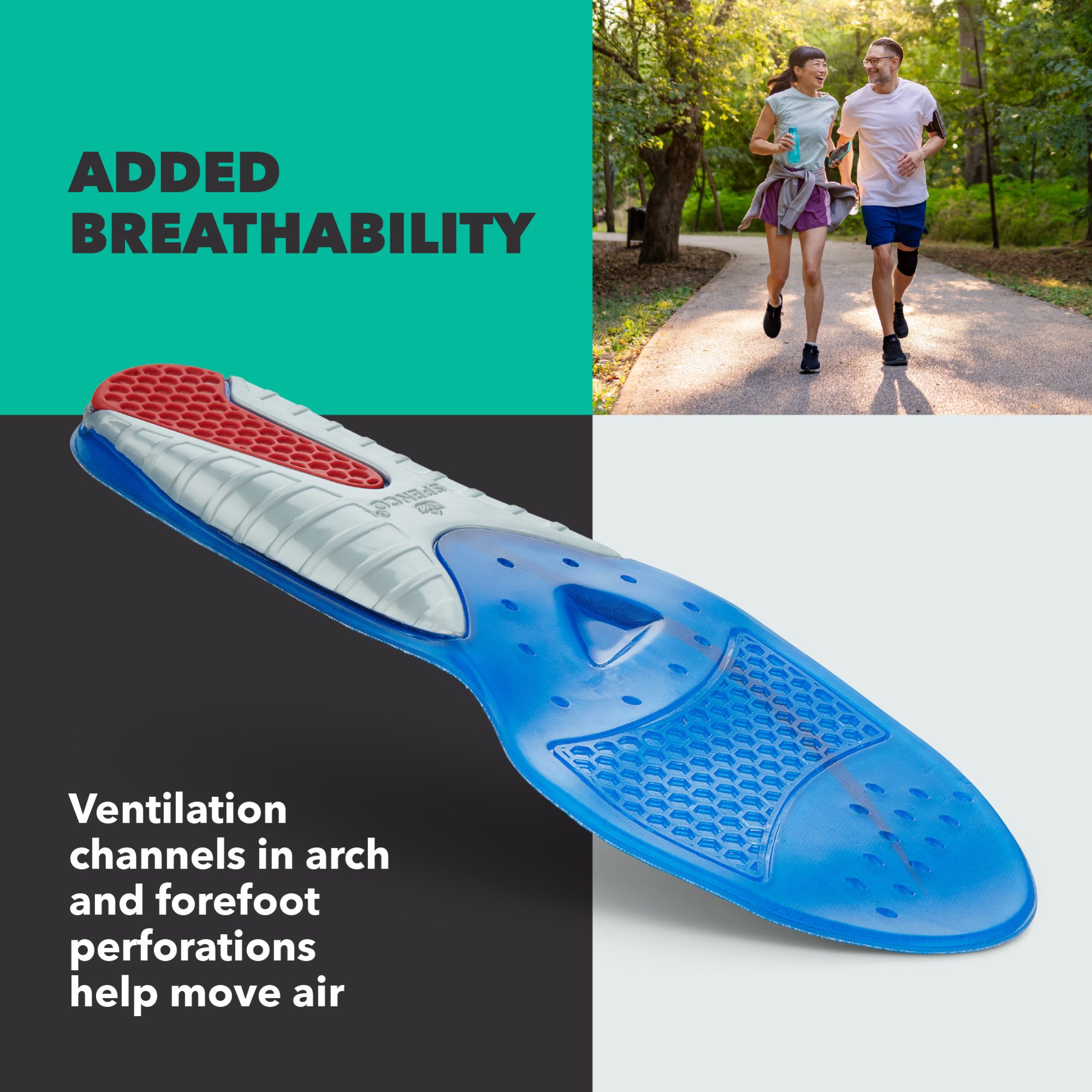 Spenco Gel Comfort + Support Insoles give your feet the cushioning, stability, and airflow they need. With supportive arches, cooling ventilation, and fresh‑keeping materials, they help you move comfortably through your day.