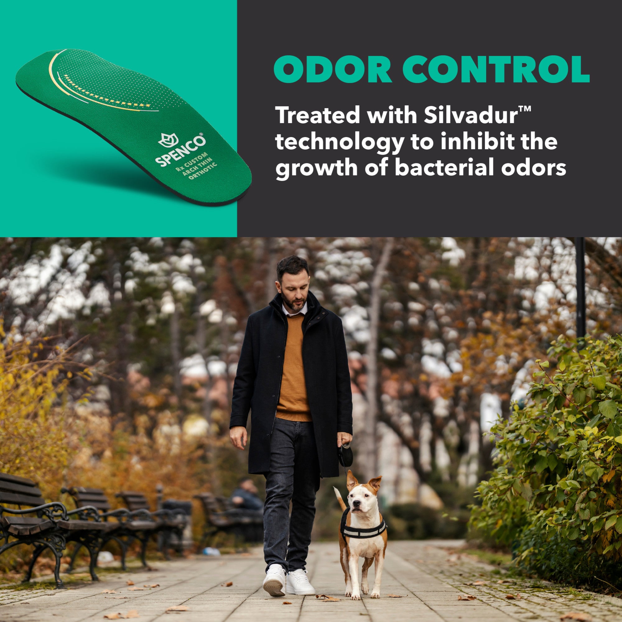 If you’re looking for an insole that offers support without changing the way your shoes fit, the Spenco Rx 3/4 Custom Arch Thin Orthotic Insole is built to make everyday movement feel easier. SpenCore shock‑absorbing cushioning helps protect your body by reducing impact, while the 3/4‑length design keeps your shoes feeling roomy and natural. The flexible heel and arch plate is designed to mold to your foot over time, giving you customized support and foot motion control that helps reduce heel and arch pain. A carbon weave plate adds structure without adding bulk, helping the insole stay thin while still offering dependable support. Comfort details are built in, too. The low‑friction top cover helps limit rubbing that can lead to discomfort or blisters, and Silvadur™ odor control treatment helps prevent the buildup of odor‑causing bacteria. Diamond air channels underneath the insole help move air through the bottom of your shoe for added breathability. Sized options help you get a better fit with minimal trimming, and the low‑profile construction works well in a wide variety of shoes. With more than 35 years of trust behind it, over six million pairs sold, and the APMA Seal of Acceptance, this orthotic delivers support you can rely on day after day.